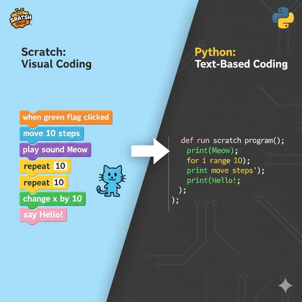 وقتی کودک مفاهیم کنترل (Control)، حلقه (Loop) و شرط (If/Else) را در اسکرچ درک کند، انتقال به یک زبان متنی مانند پایتون (Python) بسیار آسانتر میشود. کودک دیگر در حال یادگیری مفهوم نیست، بلکه فقط در حال یادگیری نحوه نوشتار آن مفهوم در یک زبان جدید است.